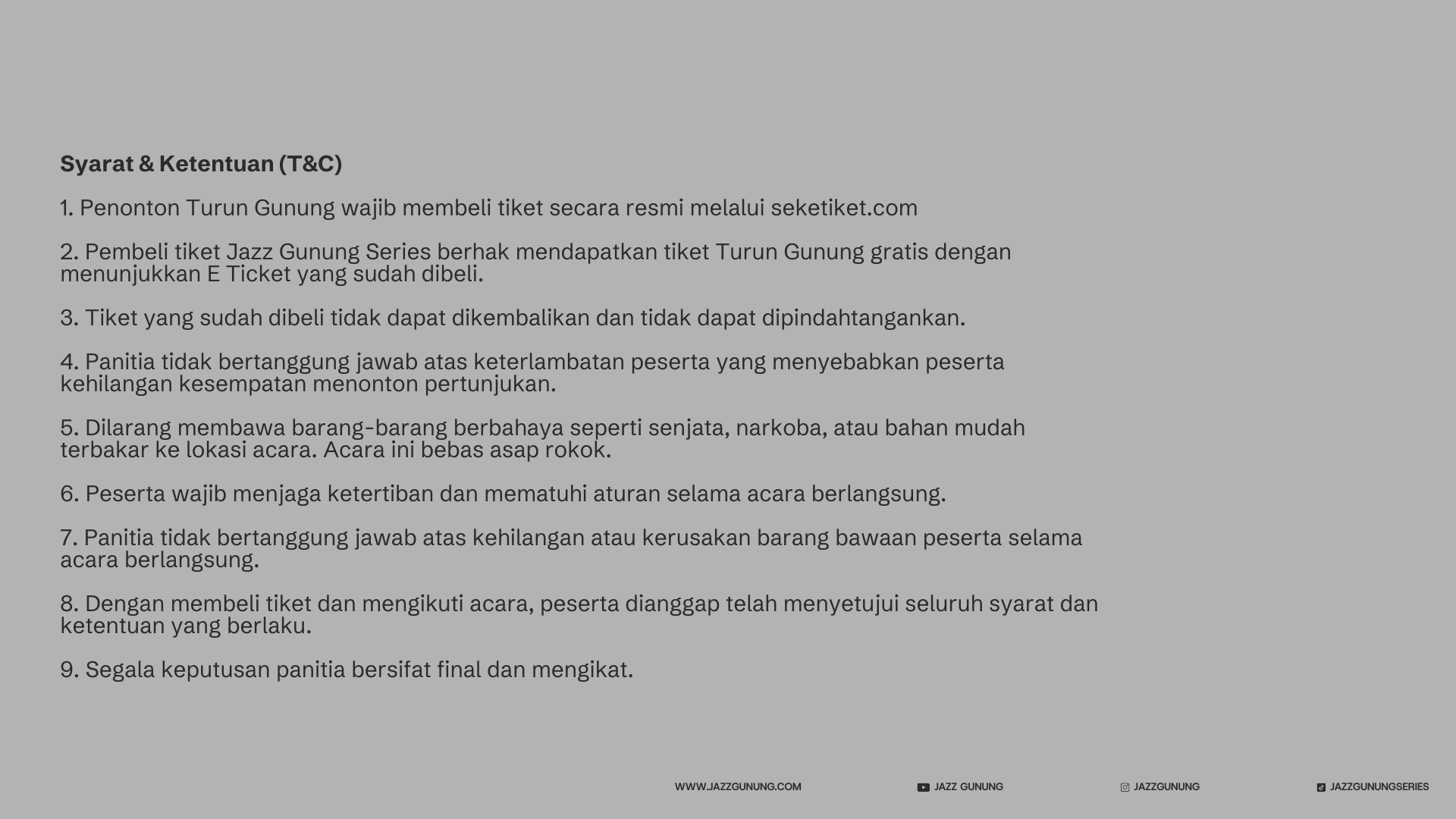 Event ini akan diselenggarakan Selasa, 19 Agustus 2025 pukul 20.00 WIB bertempat di Mata Waktu ITC Fatmawati Blok F-16, Jakarta Selatan, sekaligus menampilkan Kevin Yosua BIG 6 bersama Nesia Ardi yang mengaransemen karya komponis besar Indonesia Ismail Marzuki. Harga tiket sebesar 150 ribu, untuk pembelian tiket “Turun Gunung Merdeka!” bisa klik https://www.seketiket.com/turun-gunung-vol-2/buy